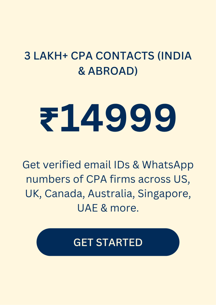Get verified email IDs & WhatsApp numbers of CPA firms across US, UK, Canada, Australia, Singapore, UAE & more.